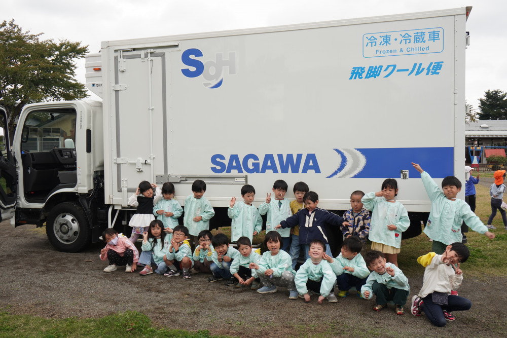 “はたらくくるま”が大好きな子どもたち!近くで見るといつもより大きく見えるトラックや、佐川急便の青いユニフォームに目をキラキラさせていました!