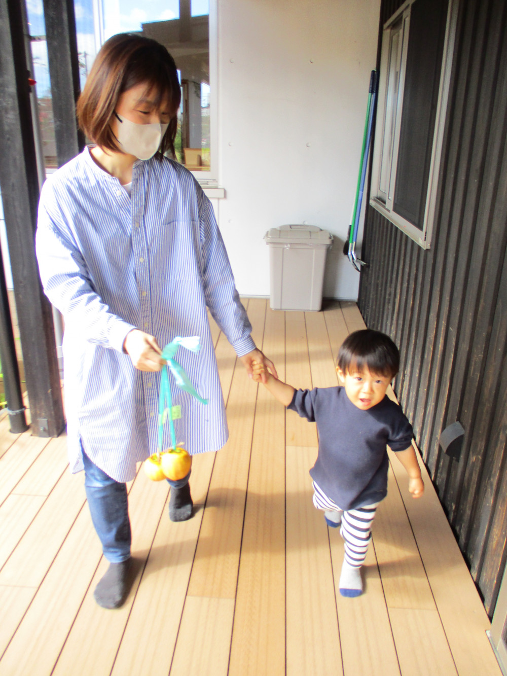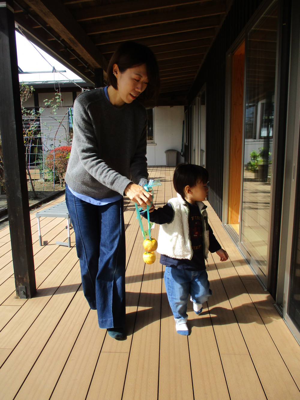 むいた柿は、テラスの日当たりのいい場所へ吊るします。