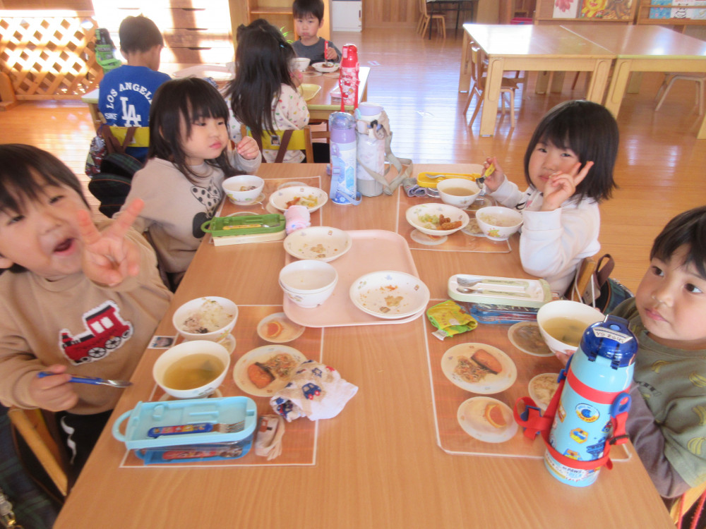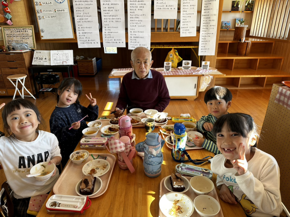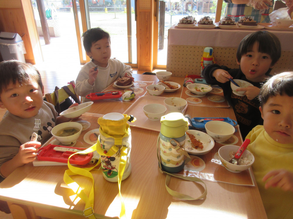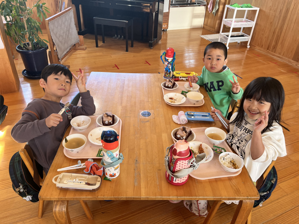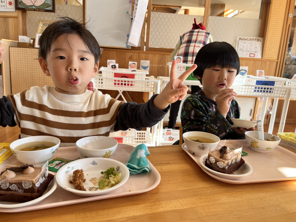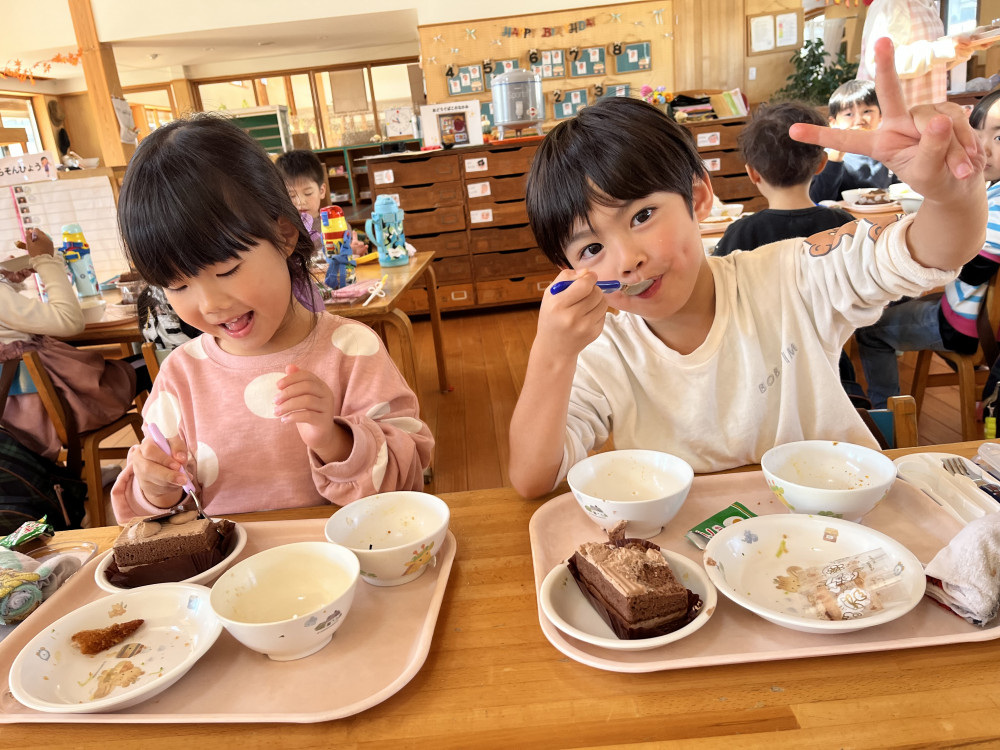 お集まりの後は、各クラスで給食さんが作ってくれたお祝い膳をおいしく食べ、デザートにはチョコレートケーキを食べて大満足の一日となりました。