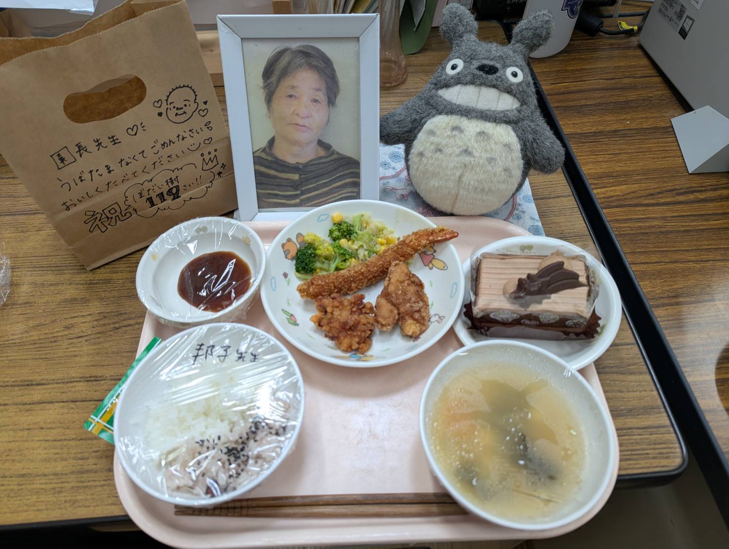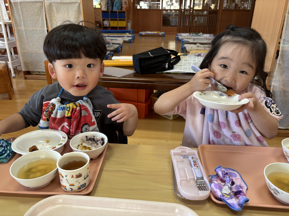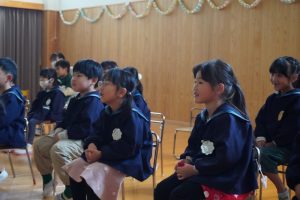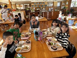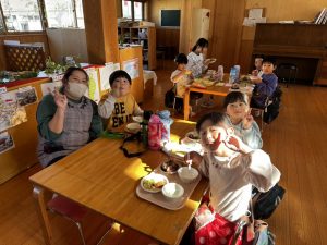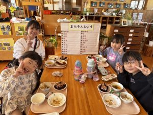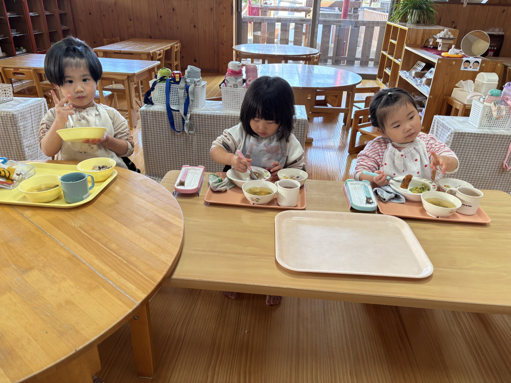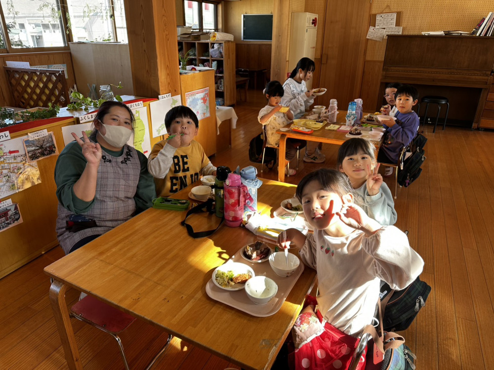 お集まりの後は、各クラスで給食さんが作ってくれたお祝い膳をおいしく食べ、デザートにはチョコレートケーキを食べて大満足の一日となりました。