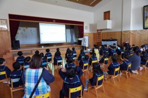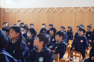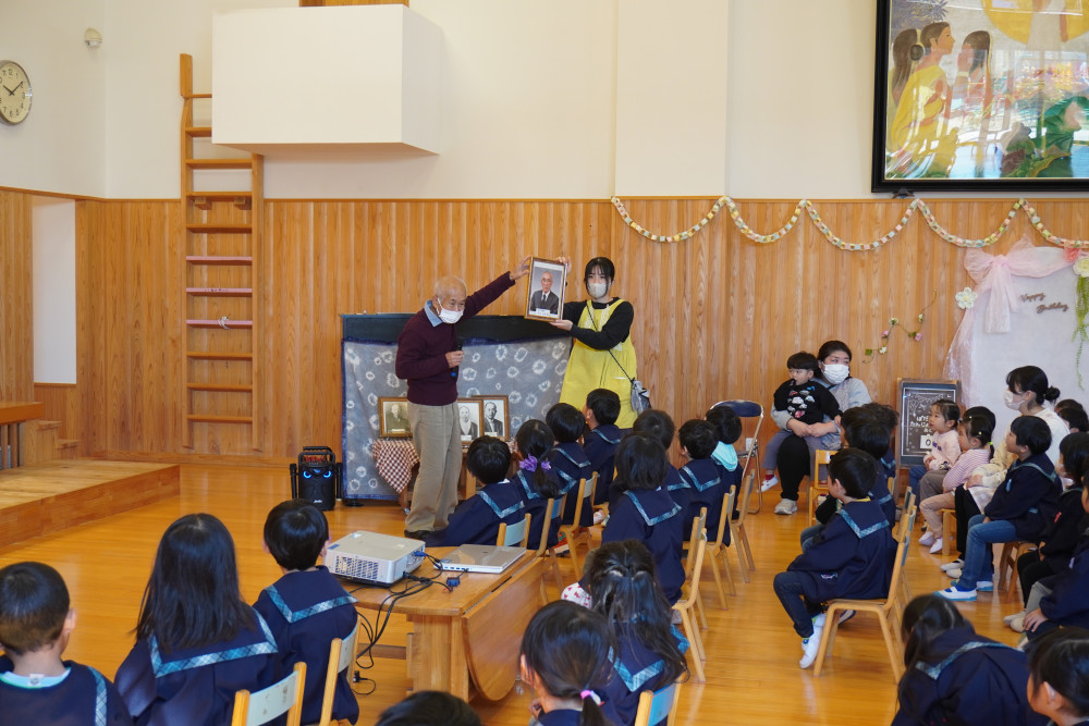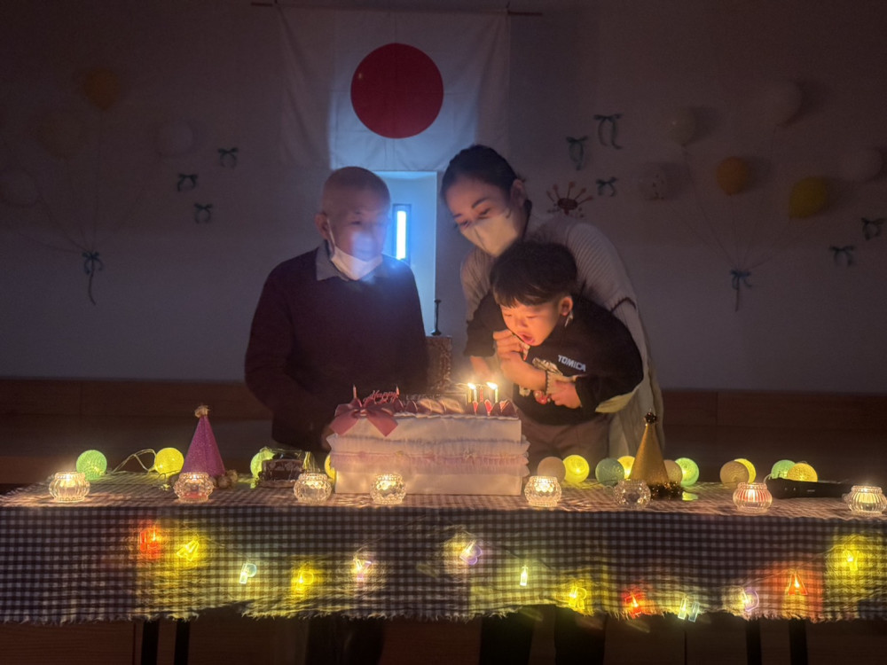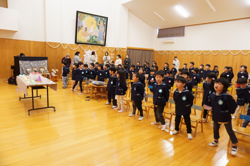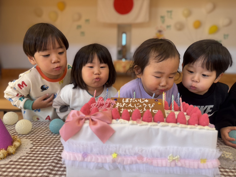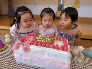 当日は、ホールに集まって園長先生の話を聞いたり、みんなの素敵な笑顔がたくさんの動画を見たり、ハッピバースデーでケーキのロウソクを吹き消し、ありがとうの花の歌を歌ってお祝いをしました。