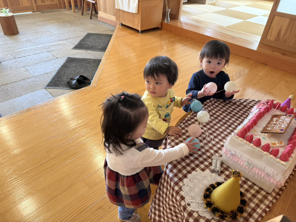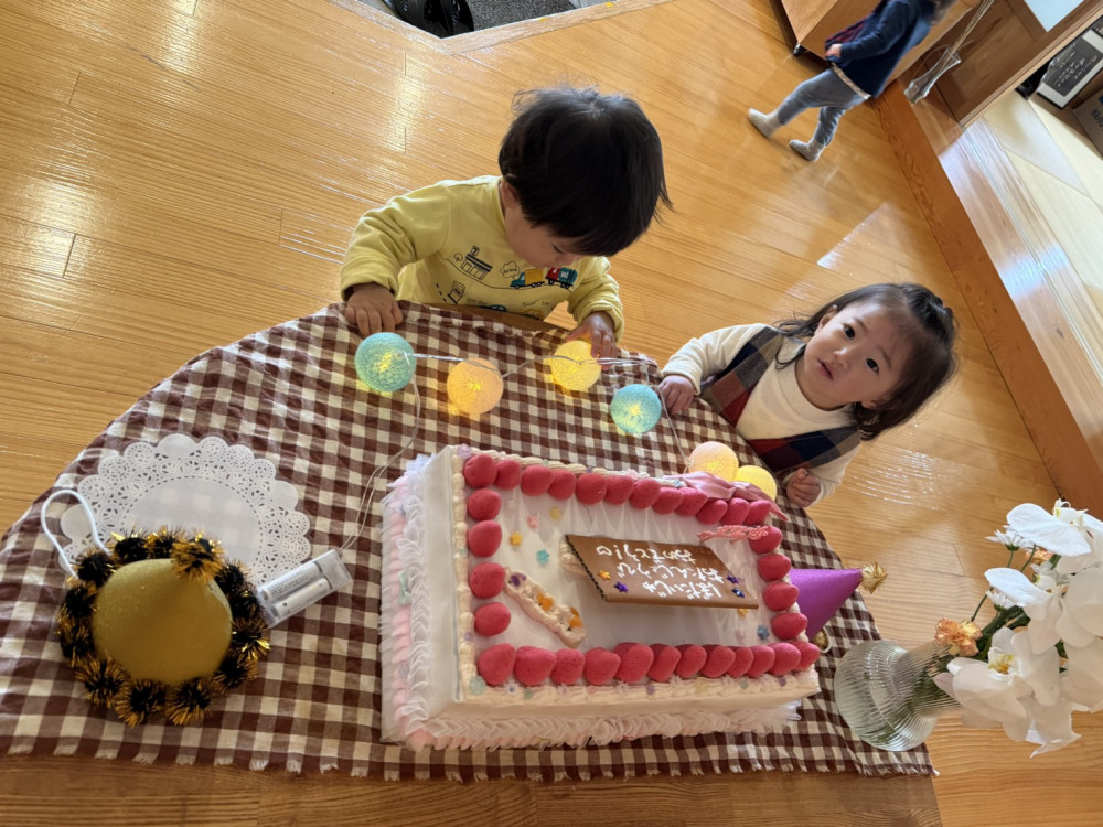 小さいクラスの子ども達も、幼稚園園舎に足を運んでケーキを触ってみたりしました。