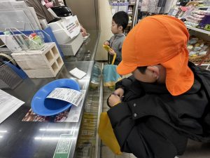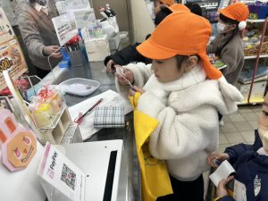 買う物を手に握りしめてレジへ。お買い物ごっこをした時とは違い本物のお金…‼ドキドキしながらも自分の財布の中からお金を出して、お釣りと商品を貰うと「買えたー!」と嬉しそうにしていました♡