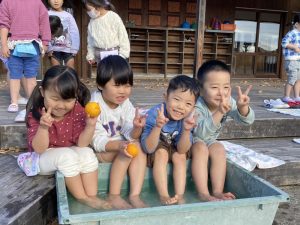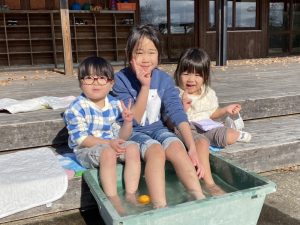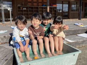 今日は、「冬至」です。1年で一番夜が長い日。そして、健康を願う意味も込められた「ゆず湯」を園で、足湯にして入りました。