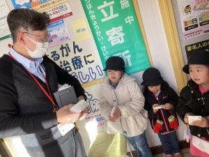 郵便局の皆さんそして局長さんがみんなのためにポケットティッシュのお土産をくれました。