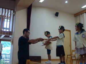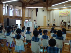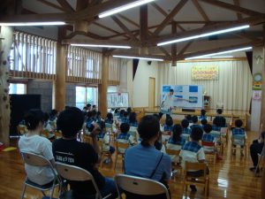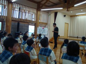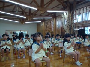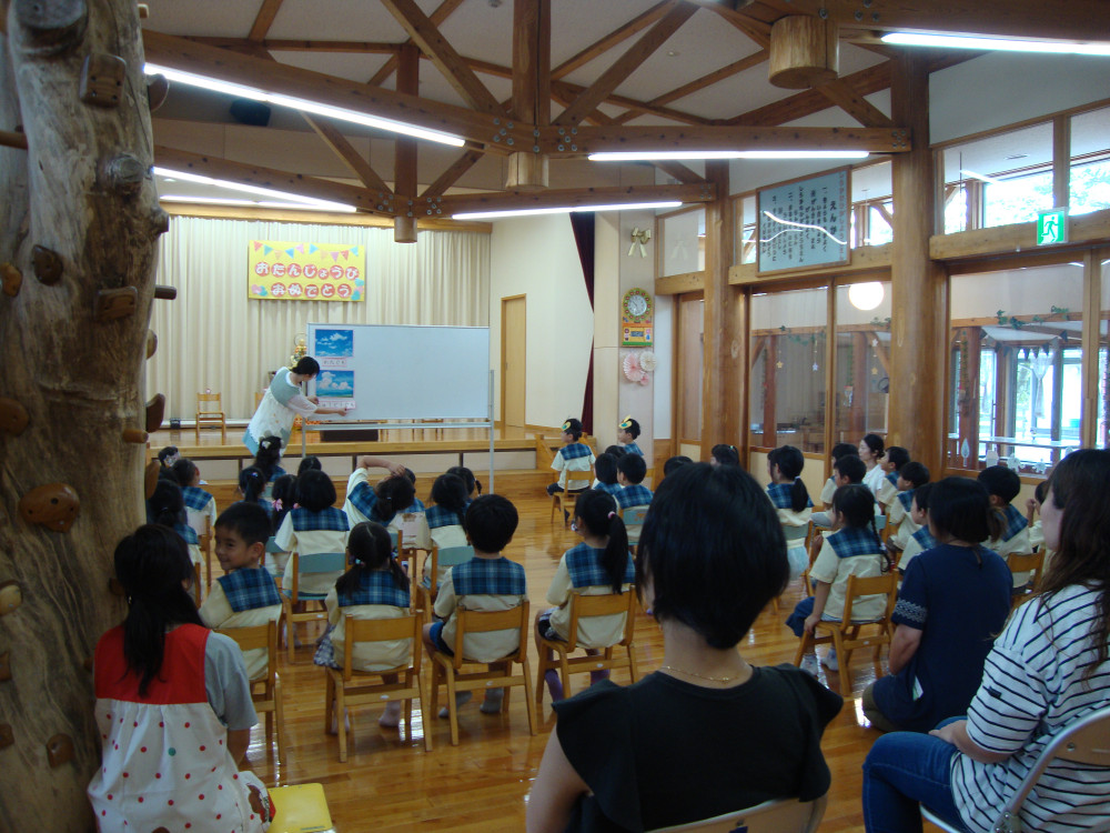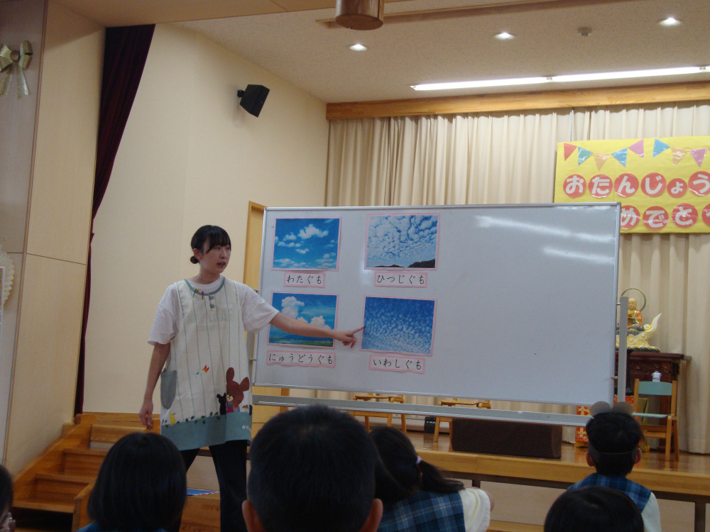 司会の先生の話では、雲の様々な形とその名前を聞きました「へぇー!」「みたときある!」など写真を見ながら興味津々な子ども達でした