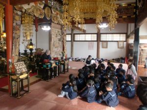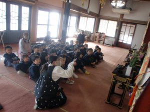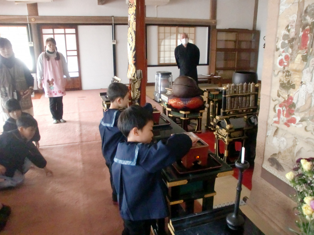 今回初めて年中組さんが進級に向けて年長組さんと専念寺に行ってきました![]()