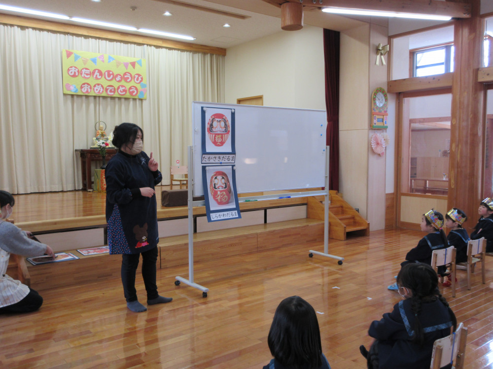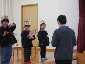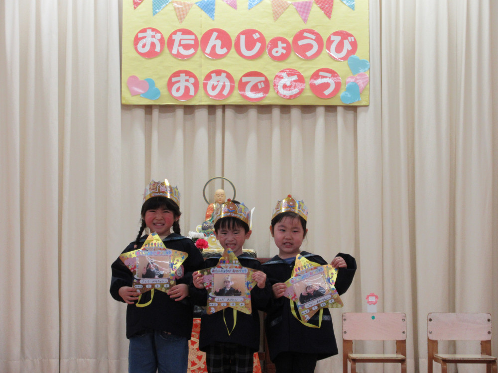 誕生児の子ども達は、家族や友達そして先生に誕生日をお祝いしてもらい、緊張している様子も見られましたがその中でも、園長先生から誕生カードを貰ったり友達から歌のプレゼントを貰ったりすると、とても嬉しそうな表情が見られました