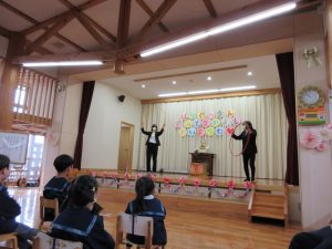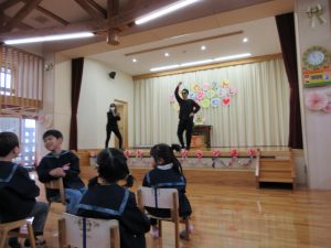 カリスマックスの曲に合わせて、ダンスやフラフープを使った技を披露してくれましたとっても面白くて楽しい出し物に子ども達は大喜びでしたPTA役員の皆様もご協力いただき、ありがとうございました